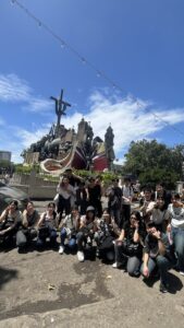歴史ある建物やモニュメントを前に、